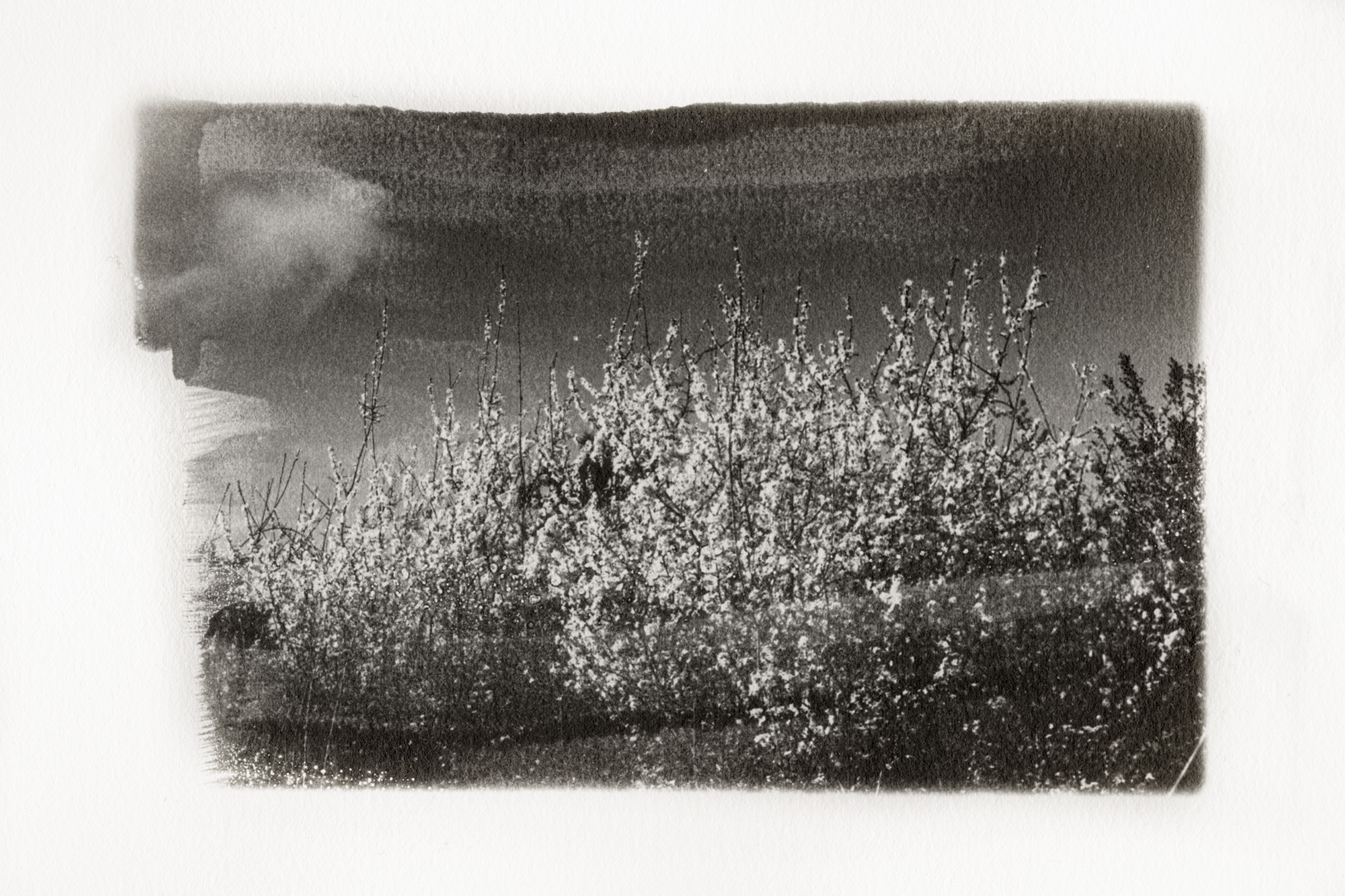 Un suo tema portante sono infatti le modalità materiche e tattili di una fotografia altrimenti ormai quasi immateriale; in parallelo correvano le mie note sulla tradizione del gesto e del segno nelle arti visive. I paesaggi interiori di di-vento sono il risultato dell’ormai consolidata esperienza di Simona nell’emulsione liquida su carta cotone, del suo interesse profondissimo per le filosofie orientali, del suo rapporto empatico con la natura e della sua serena preoccupazione nei confronti dell’esistenza.